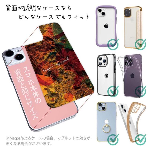 | 注意事項 | ・他の商品とは異なり、お客様都合による交換・返品・キャンセルは一切できない商品となります。ご注文の前に必ず間違いがないかを入念に確認してください。 ・また、シートの取り付け時におけるケースやスマホ本体の破損などは、弊社の責任範囲外となります。 ・UV印刷という方法でシートの印刷をしているため、表面は少しザラついているマット加工になります(商品画像より色が沈んで感じるかも知れません)。 ・背面が曲線になっている機種は対応できません(例えばXperia XZ3など)。 ・お手持ちのスマホケースの背面の状況によって、デザインシートの透け方が変わりますので、予めご了承下さい(曇りガラスのように透けにくい場合はデザインが見えにくくなります)。 ・スマホケースは付属していません(別売)。 ・商品画像の5枚目と6枚目の写真は、スマホの背面の色によるサンプル画像です。シートの背面が透明の場合は、スマホの背面が透けるという意味になりますので、背景の色を変更している訳ではありません。 |