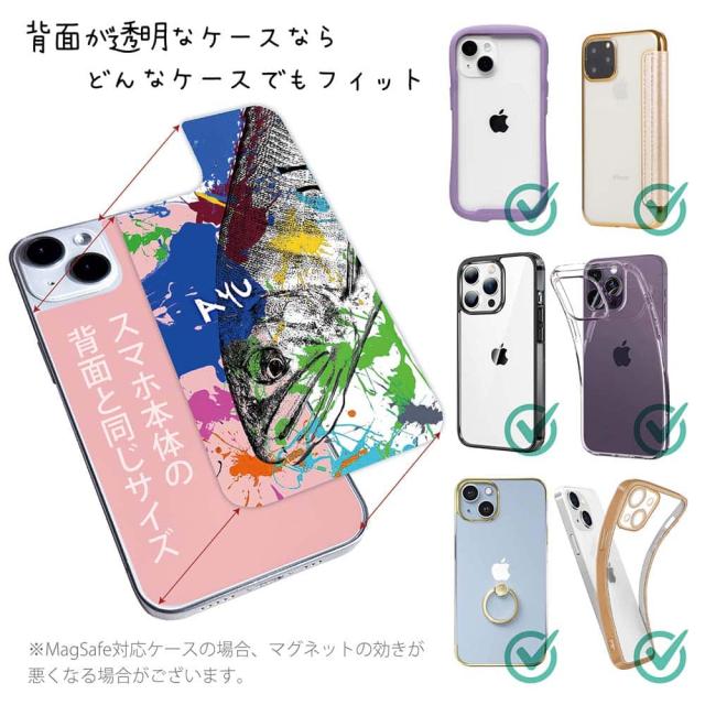 | デザインシートについて | 商品画像にあるとおり、スマホの背面の面積に合わせて象(かた)どっているので、背面が透明なケースなら、基本的にどんなケースにも対応できます。 商品画像はiPhone14をベースに撮影して掲載していますが、実際はご希望の機種毎にシートの形を切り替えて作成いたします。 コンポスケースの場合・・・当店で販売しているコンポスケースは、ケースの内側に若干カーブがあるため、通常のデザインシートを入れて使うと、左右に少し余白が空きすぎてしまいます。コンポスケース用のデザインシートをご希望の場合は、備考欄に「コンポスケース用を希望」とご記載下さい。 |