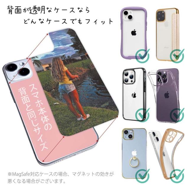 | デザインシートについて | 商品画像にあるとおり、スマホの背面の面積に合わせて象(かた)どっているので、背面が透明なケースなら、基本的にどんなケースにも対応できます。 商品画像はiPhone14をベースに撮影して掲載していますが、実際はご希望の機種毎にシートの形を切り替えて作成いたします。 コンポスケースの場合・・・当店で販売しているコンポスケースは、ケースの内側に若干カーブがあるため、通常のデザインシートを入れて使うと、左右に少し余白が空きすぎてしまいます。コンポスケース用のデザインシートをご希望の場合は、備考欄に「コンポスケース用を希望」とご記載下さい。 |