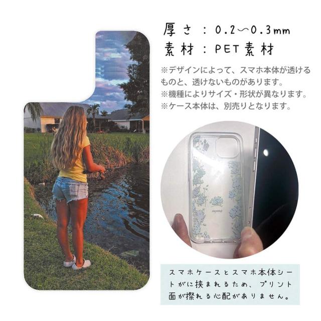 | 注意事項 | ・他の商品とは異なり、お客様都合による交換・返品・キャンセルは一切できない商品となります。ご注文の前に必ず間違いがないかを入念に確認してください。 ・また、シートの取り付け時におけるケースやスマホ本体の破損などは、弊社の責任範囲外となります。 ・UV印刷という方法でシートの印刷をしているため、表面は少しザラついているマット加工になります(商品画像より色が沈んで感じるかも知れません)。 ・背面が曲線になっている機種は対応できません(例えばXperia XZ3など)。 ・お手持ちのスマホケースの背面の状況によって、デザインシートの透け方が変わりますので、予めご了承下さい(曇りガラスのように透けにくい場合はデザインが見えにくくなります)。 ・スマホケースは付属していません(別売)。 ・商品画像の5枚目と6枚目の写真は、スマホの背面の色によるサンプル画像です。シートの背面が透明の場合は、スマホの背面が透けるという意味になりますので、背景の色を変更している訳ではありません。 |