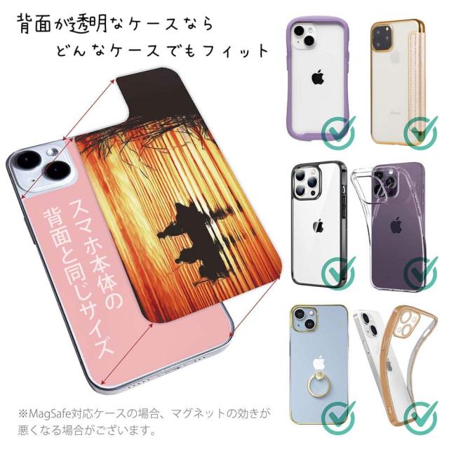 | デザインシートについて | 商品画像にあるとおり、スマホの背面の面積に合わせて象(かた)どっているので、背面が透明なケースなら、基本的にどんなケースにも対応できます。 商品画像はiPhone14をベースに撮影して掲載していますが、実際はご希望の機種毎にシートの形を切り替えて作成いたします。 コンポスケースの場合・・・当店で販売しているコンポスケースは、ケースの内側に若干カーブがあるため、通常のデザインシートを入れて使うと、左右に少し余白が空きすぎてしまいます。コンポスケース用のデザインシートをご希望の場合は、備考欄に「コンポスケース用を希望」とご記載下さい。 |