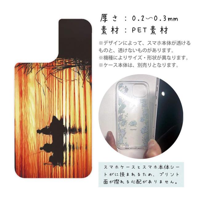 | 注意事項 | ・他の商品とは異なり、お客様都合による交換・返品・キャンセルは一切できない商品となります。ご注文の前に必ず間違いがないかを入念に確認してください。 ・また、シートの取り付け時におけるケースやスマホ本体の破損などは、弊社の責任範囲外となります。 ・UV印刷という方法でシートの印刷をしているため、表面は少しザラついているマット加工になります(商品画像より色が沈んで感じるかも知れません)。 ・背面が曲線になっている機種は対応できません(例えばXperia XZ3など)。 ・お手持ちのスマホケースの背面の状況によって、デザインシートの透け方が変わりますので、予めご了承下さい(曇りガラスのように透けにくい場合はデザインが見えにくくなります)。 ・スマホケースは付属していません(別売)。 ・商品画像の5枚目と6枚目の写真は、スマホの背面の色によるサンプル画像です。シートの背面が透明の場合は、スマホの背面が透けるという意味になりますので、背景の色を変更している訳ではありません。 |