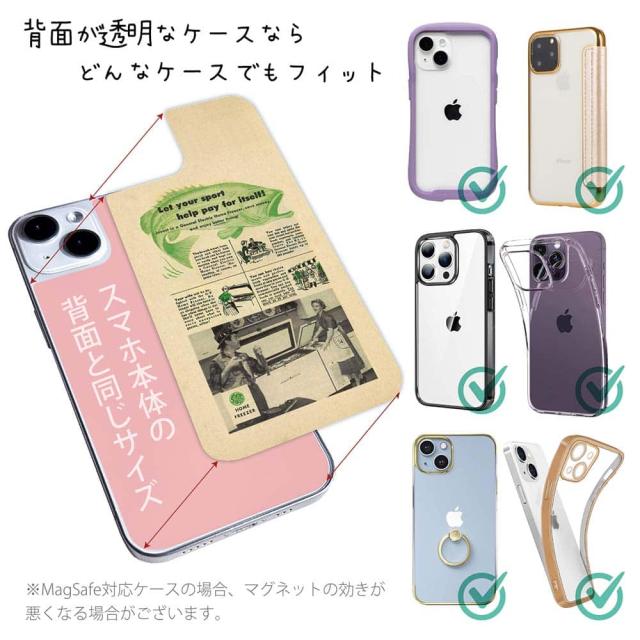 | 注意事項 | ・他の商品とは異なり、お客様都合による交換・返品・キャンセルは一切できない商品となります。ご注文の前に必ず間違いがないかを入念に確認してください。 ・また、シートの取り付け時におけるケースやスマホ本体の破損などは、弊社の責任範囲外となります。 ・UV印刷という方法でシートの印刷をしているため、表面は少しザラついているマット加工になります(商品画像より色が沈んで感じるかも知れません)。 ・背面が曲線になっている機種は対応できません(例えばXperia XZ3など)。 ・お手持ちのスマホケースの背面の状況によって、デザインシートの透け方が変わりますので、予めご了承下さい(曇りガラスのように透けにくい場合はデザインが見えにくくなります)。 ・スマホケースは付属していません(別売)。 ・商品画像の5枚目と6枚目の写真は、スマホの背面の色によるサンプル画像です。シートの背面が透明の場合は、スマホの背面が透けるという意味になりますので、背景の色を変更している訳ではありません。 |