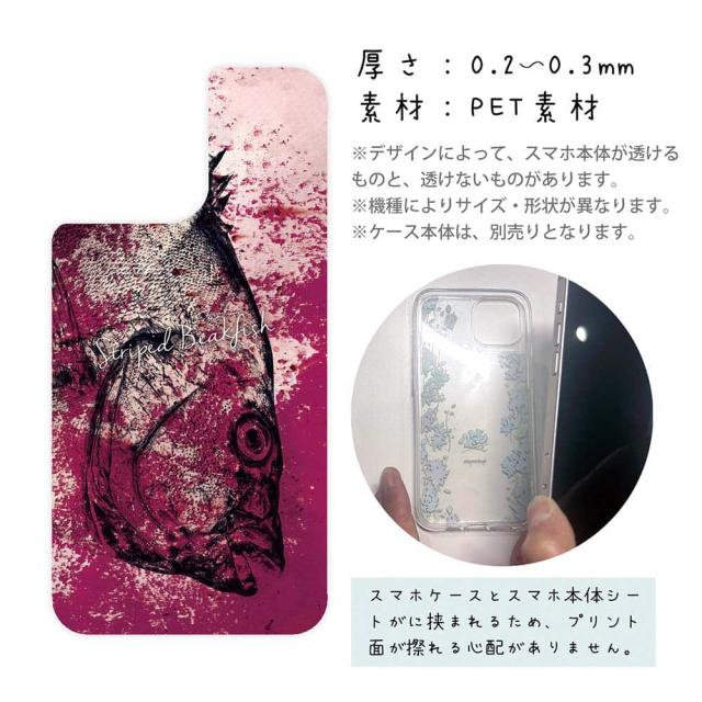 | 注意事項 | ・他の商品とは異なり、お客様都合による交換・返品・キャンセルは一切できない商品となります。ご注文の前に必ず間違いがないかを入念に確認してください。 ・また、シートの取り付け時におけるケースやスマホ本体の破損などは、弊社の責任範囲外となります。 ・UV印刷という方法でシートの印刷をしているため、表面は少しザラついているマット加工になります(商品画像より色が沈んで感じるかも知れません)。 ・背面が曲線になっている機種は対応できません(例えばXperia XZ3など)。 ・お手持ちのスマホケースの背面の状況によって、デザインシートの透け方が変わりますので、予めご了承下さい(曇りガラスのように透けにくい場合はデザインが見えにくくなります)。 ・スマホケースは付属していません(別売)。 ・商品画像の5枚目と6枚目の写真は、スマホの背面の色によるサンプル画像です。シートの背面が透明の場合は、スマホの背面が透けるという意味になりますので、背景の色を変更している訳ではありません。 |