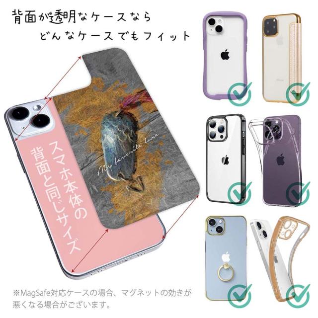 | 注意事項 | ・他の商品とは異なり、お客様都合による交換・返品・キャンセルは一切できない商品となります。ご注文の前に必ず間違いがないかを入念に確認してください。 ・また、シートの取り付け時におけるケースやスマホ本体の破損などは、弊社の責任範囲外となります。 ・UV印刷という方法でシートの印刷をしているため、表面は少しザラついているマット加工になります(商品画像より色が沈んで感じるかも知れません)。 ・背面が曲線になっている機種は対応できません(例えばXperia XZ3など)。 ・お手持ちのスマホケースの背面の状況によって、デザインシートの透け方が変わりますので、予めご了承下さい(曇りガラスのように透けにくい場合はデザインが見えにくくなります)。 ・スマホケースは付属していません(別売)。 ・商品画像の5枚目と6枚目の写真は、スマホの背面の色によるサンプル画像です。シートの背面が透明の場合は、スマホの背面が透けるという意味になりますので、背景の色を変更している訳ではありません。 |