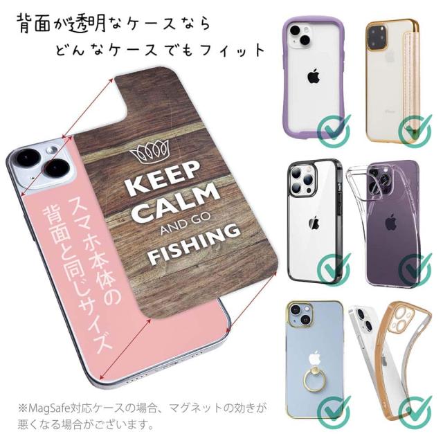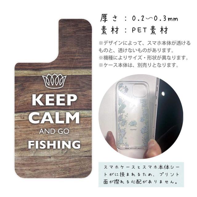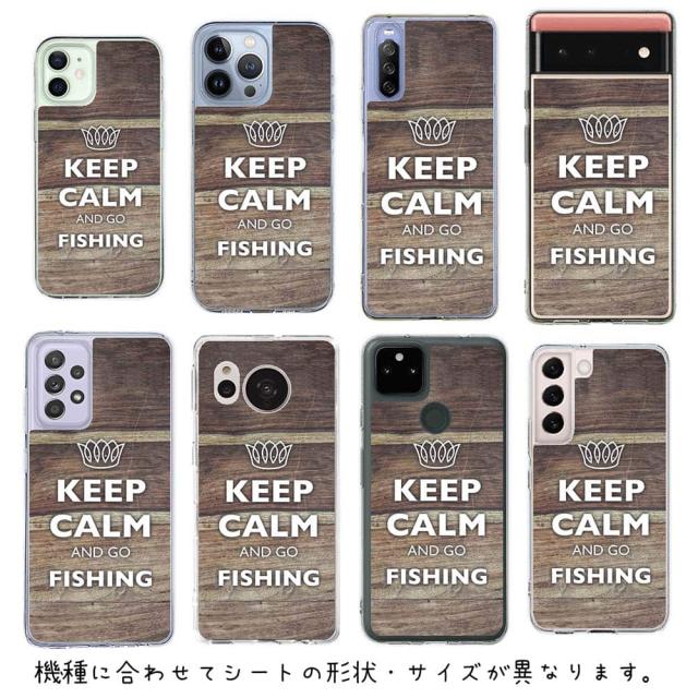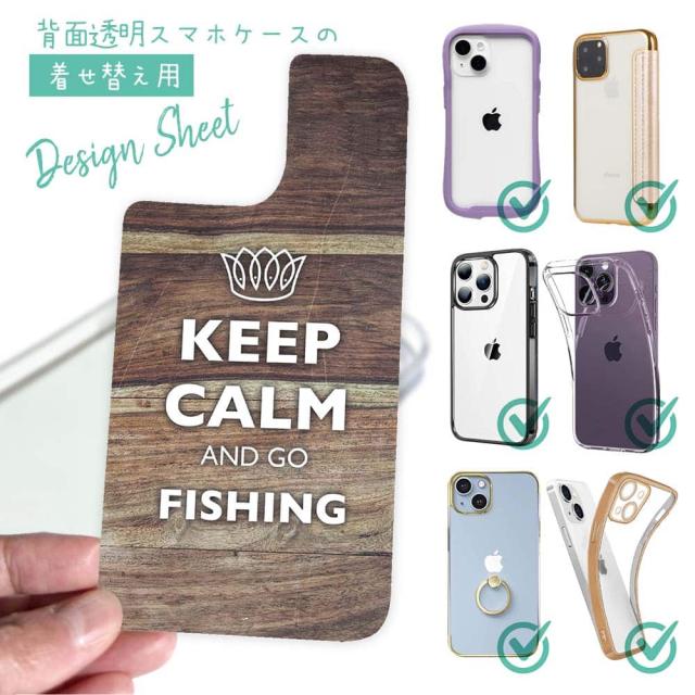 スマホケース iPhone Google Pixel Xperia Galaxy AQUOS arrows 着せ替え シート インナーシート スマホカバー 背面 透明 クリア オリジナル デザイン 釣り 魚 ルアー KEEP CALM AND OF FISHING 木目
