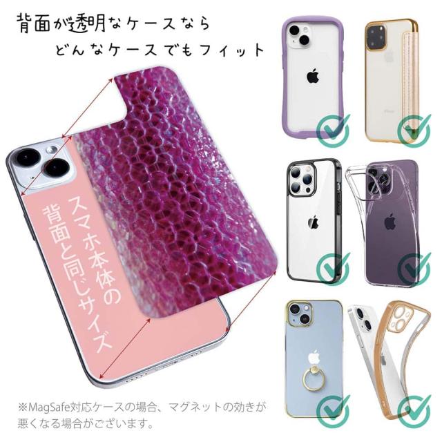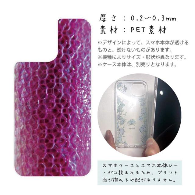 | 注意事項 | ・他の商品とは異なり、お客様都合による交換・返品・キャンセルは一切できない商品となります。ご注文の前に必ず間違いがないかを入念に確認してください。 ・また、シートの取り付け時におけるケースやスマホ本体の破損などは、弊社の責任範囲外となります。 ・UV印刷という方法でシートの印刷をしているため、表面は少しザラついているマット加工になります(商品画像より色が沈んで感じるかも知れません)。 ・背面が曲線になっている機種は対応できません(例えばXperia XZ3など)。 ・お手持ちのスマホケースの背面の状況によって、デザインシートの透け方が変わりますので、予めご了承下さい(曇りガラスのように透けにくい場合はデザインが見えにくくなります)。 ・スマホケースは付属していません(別売)。 ・商品画像の5枚目と6枚目の写真は、スマホの背面の色によるサンプル画像です。シートの背面が透明の場合は、スマホの背面が透けるという意味になりますので、背景の色を変更している訳ではありません。 |