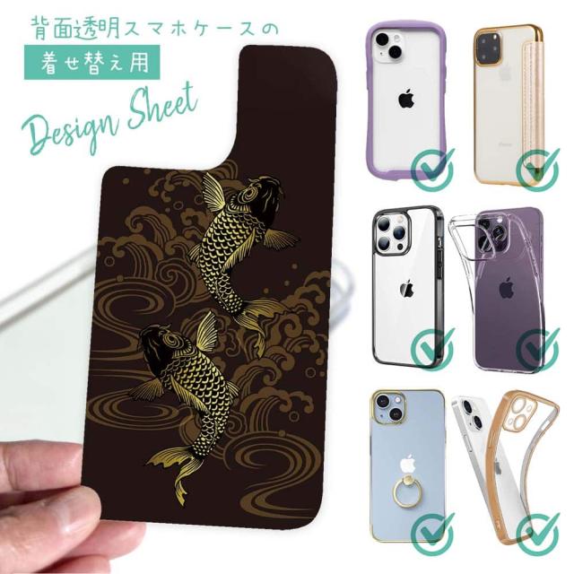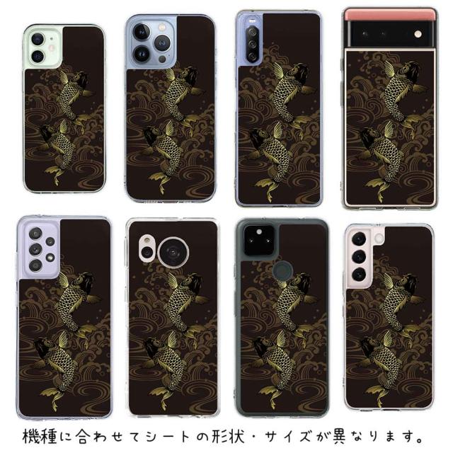 スマホケース iPhone Google Pixel Xperia Galaxy AQUOS arrows 着せ替え シート インナーシート スマホカバー 背面 透明 クリア オリジナル デザイン 釣り 魚 ルアー タトゥー風昇り鯉 ゴールド&ブラック