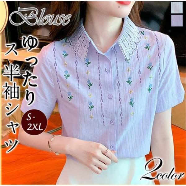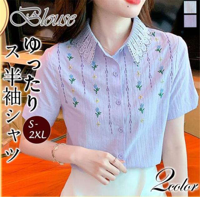 半袖シャツ レディース ブラウス 折り襟 刺繍 花柄 レース トップス 五分袖 きれいめ おしゃれ ゆったり カジュアル 春夏 通勤通学 着痩せ
