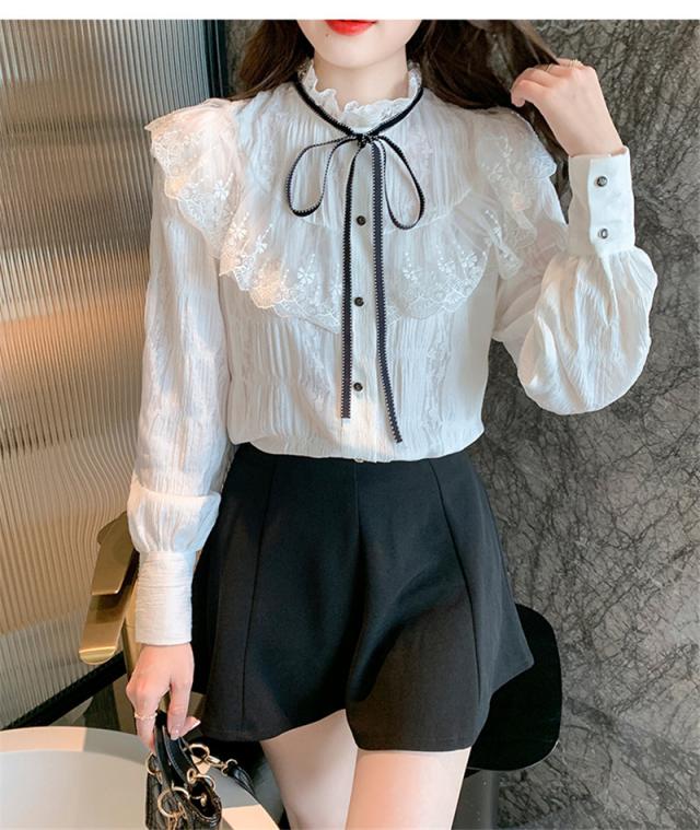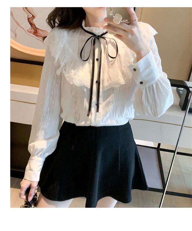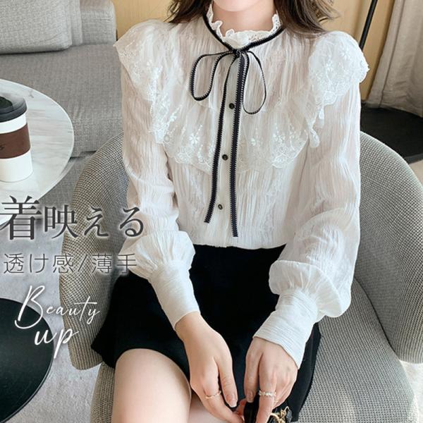 ブラウス シフォンブラウス 夏 レディース レース付き レース襟 トップス サマーブラウス シフォン 蝶結び付き リボン 長袖シャツ 透け感 薄手