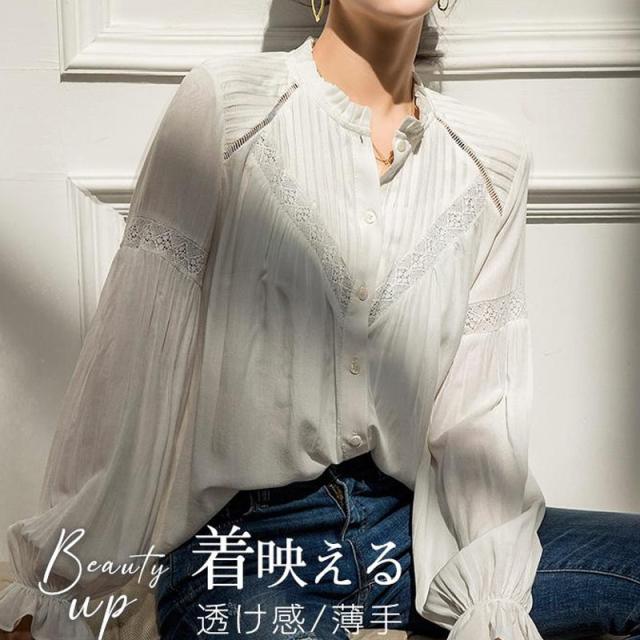 ブラウス 夏 レディース レース付き レース襟 トップス バルーン袖 サマーブラウス プルオーバー シャツ 長袖シャツ 透け感 薄手 白 フォーマル