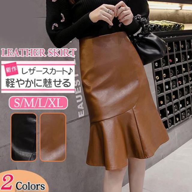 スカート レディース マーメイド ロングスカート フェイクレザー フレア ボトムス Aライン PU 体型カバー 大きいサイズ 通勤 着やせ 上品 膝丈