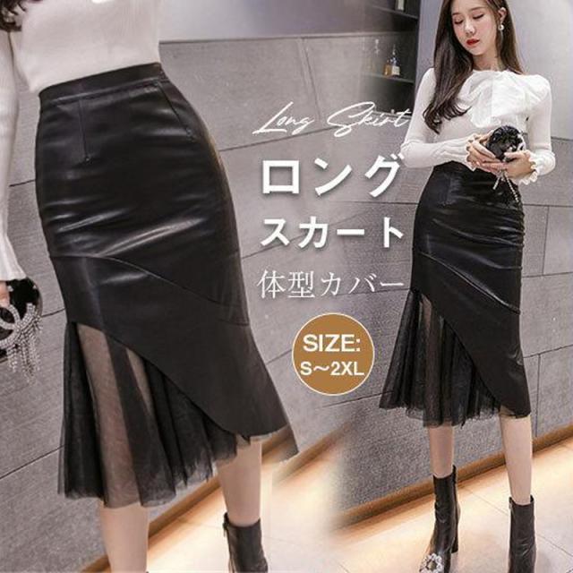 スカート レディース レース ロングスカート フェイクレザー マーメイド ボトムス Aライン PU 体型カバー 大きいサイズ 通勤 着やせ 上品 膝丈