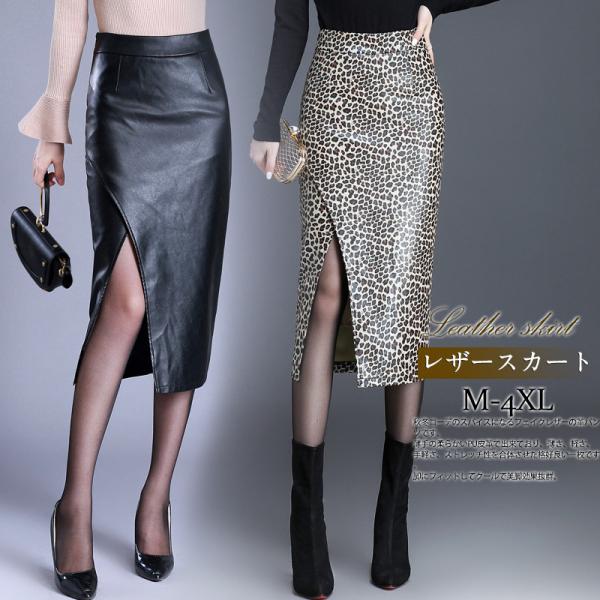 レザースカート レディース ロングスカート スリット ハイウエスト フェイクレザースカート 着痩せ タイト 細身 体型カバー ストレート イベント