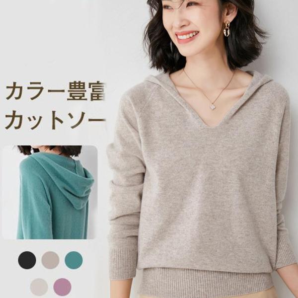 カットソー トップス 長袖 パーカー レディース ニット 可愛い フード付き アウター プルオーバー カジュアル ニットソー 無地 セーター 秋 春