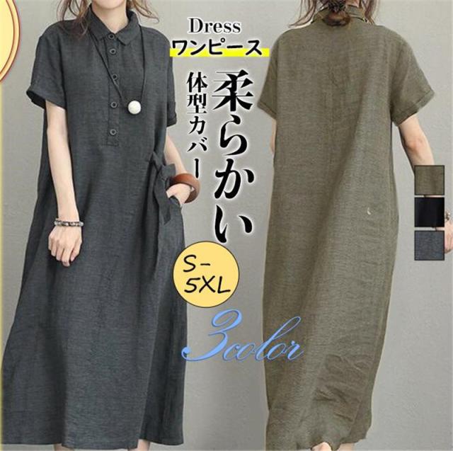 ワンピース レディース カジュアルワンピース ポケット付き オシャレ 無地 半袖 体型カバー 大きいサイズ ゆったり 部屋着 着痩せ 旅行 春 秋