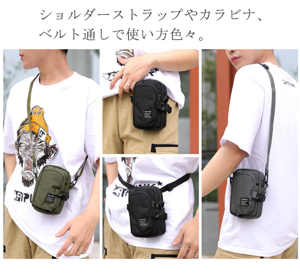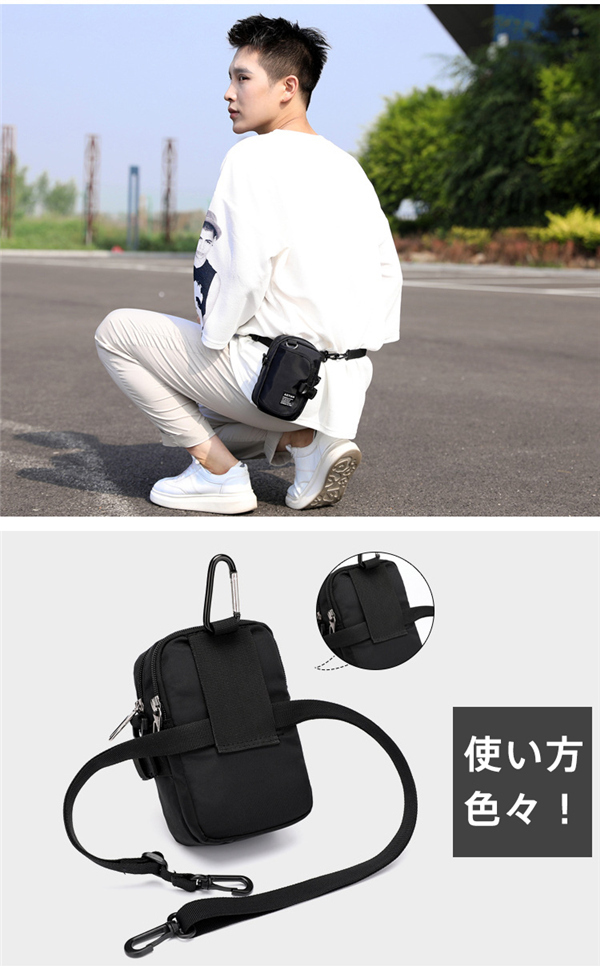 ショルダーストラップやカラビナ、ベルト通しで使い方色々。
