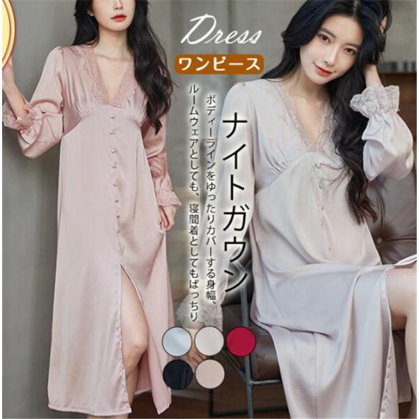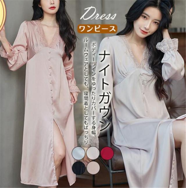 ナイトガウン ワンピース レディース ネグリジェ 長袖 レース 無地 春秋 ルームウェア シンプル 部屋着 ゆったり ひんやり おしゃれ セクシー