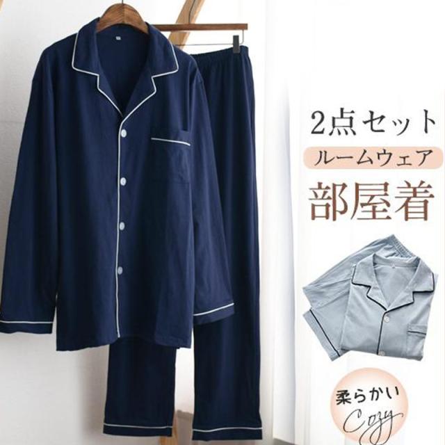 ルームウェア 部屋着 パジャマ メンズ セットアップ 大人 シンプル 春 秋 寝巻き 長袖 前開き 上下セット 大きいサイズ ナイトウェア 2点セット