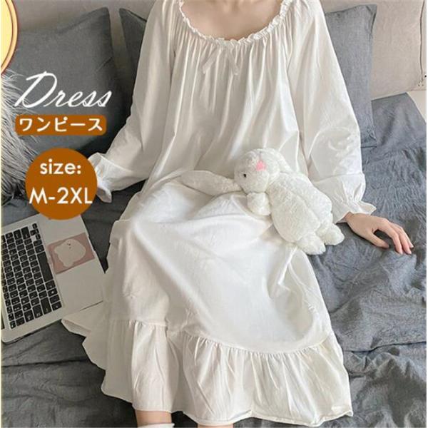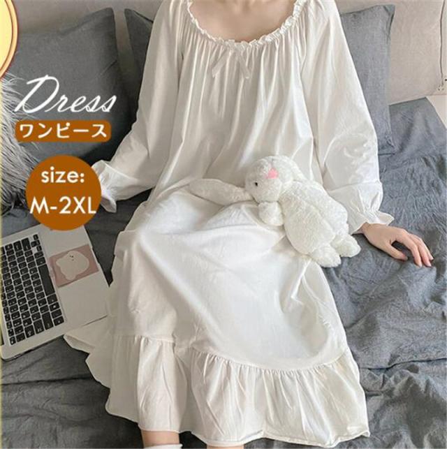 半額セール ナイトガウン レディース ネグリジェ 長袖 ロング丈 ホワイト 姫 ルームウェア シンプル 部屋着 ゆったり 薄手 おしゃれ 可愛い 春夏