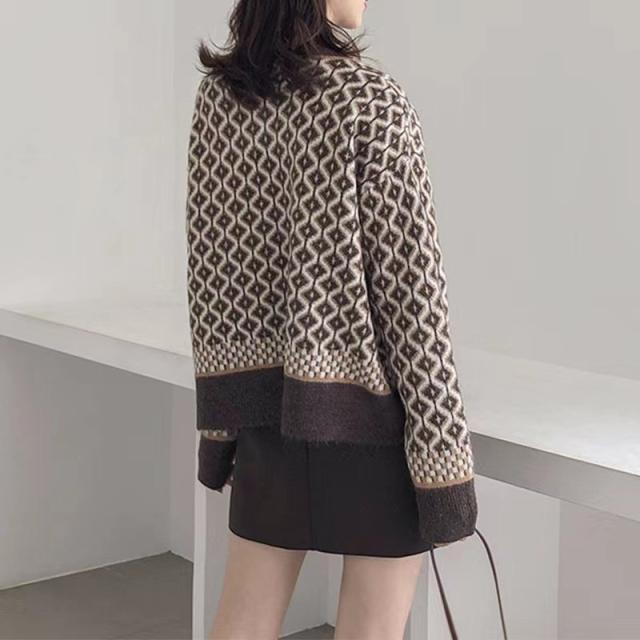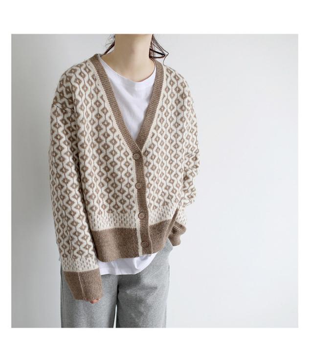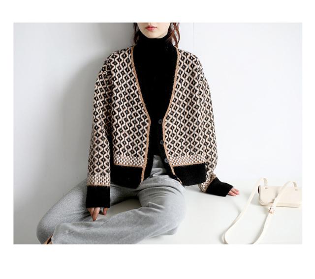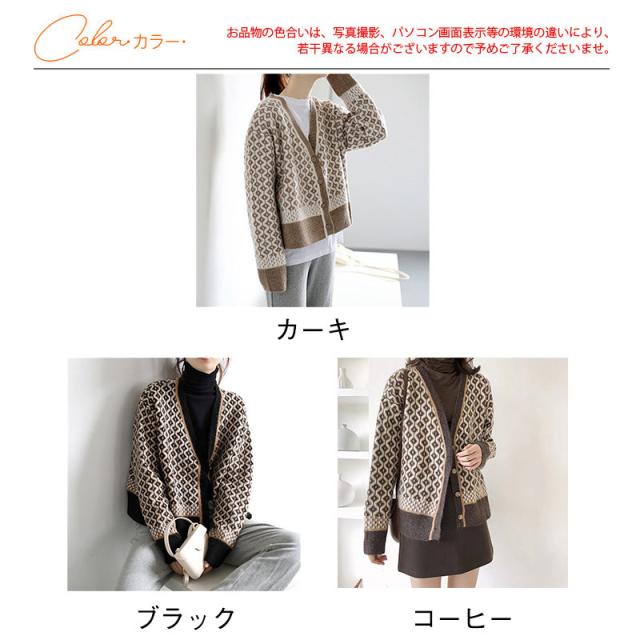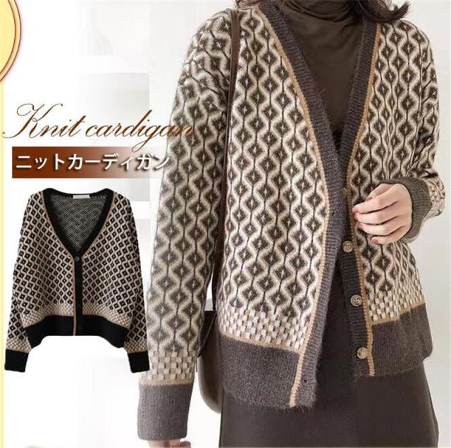 ニットカーディガン レディース カーディガン トップス トライバル柄 Vネック アウター カットソー ゆったり 羽織り 秋冬 母の日 プレゼント