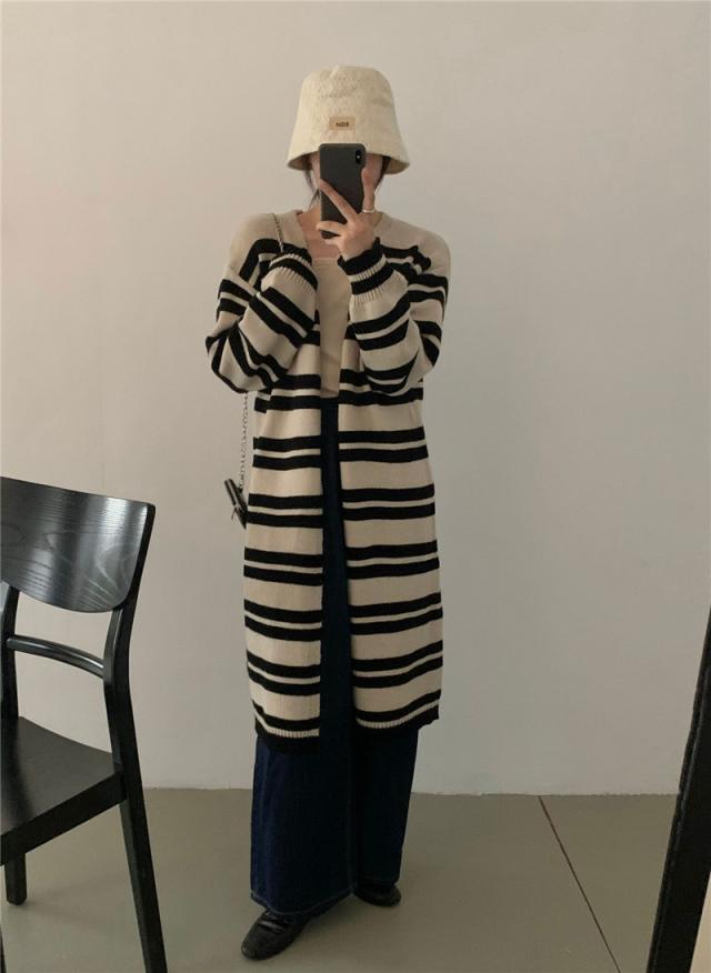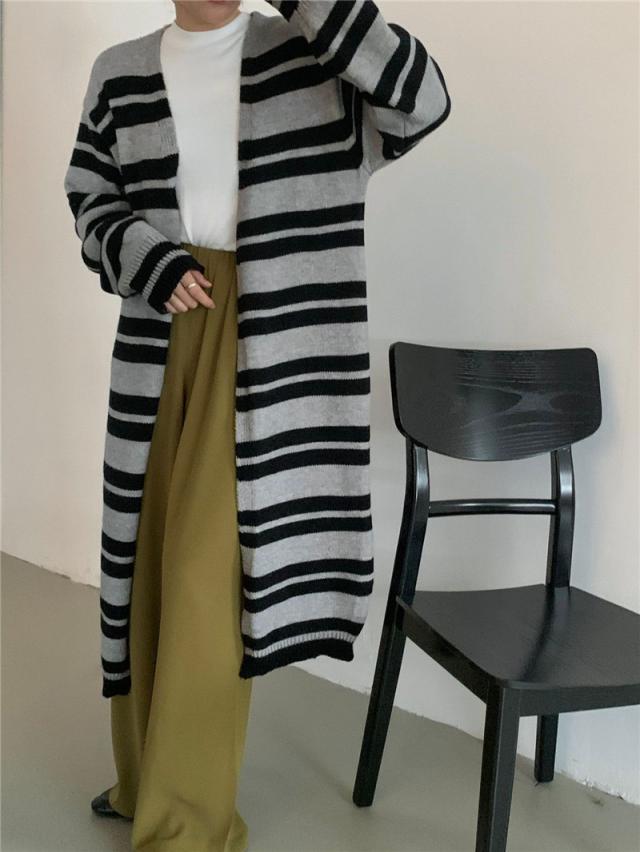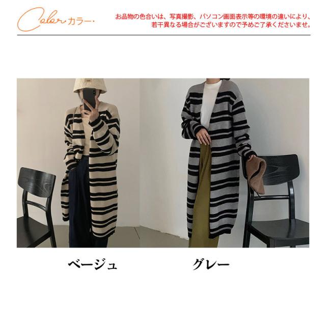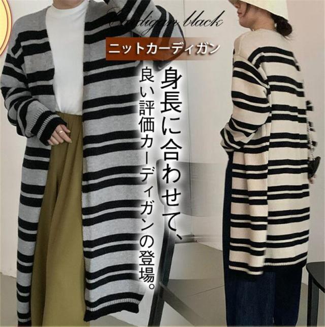 カーディガン レディース ニットカーデ ロング丈 ストライプ柄 秋服 コート 羽織り アウター カジュアル おしゃれ 薄手 ゆったり イベント 大人