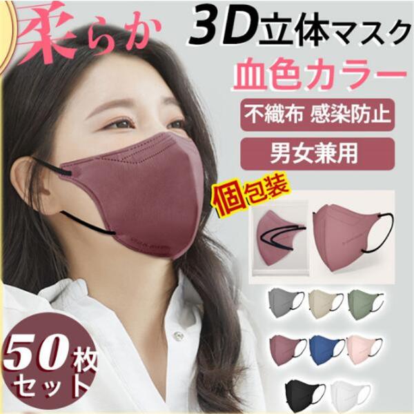 3D立体マスク 50枚 立体マスク 小顔効果 血色カラー 小さめ 蒸れない 柔らか 不織布 3D立体 血色マスク KN95 快適 男女兼用 感染防止
