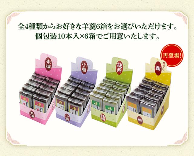 本煉・小倉 各60g×10本入 栗・抹茶(まっちゃ) 各59g×10本入 →お好きな羊羹6箱をお選びください。 |