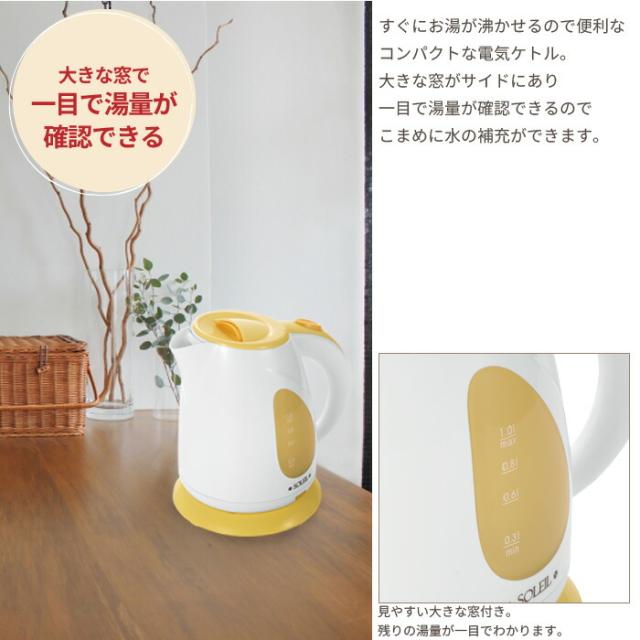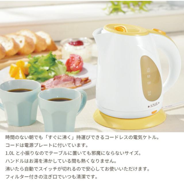 | ● 電気ケトル0.8L ● 電気湯沸かしケトルSV 1.0L ● LEDライト付電気ケトル1.5L ● 電気ケトル1.0L ※このページは[電気ケトル1.0L]を販売しております。 |