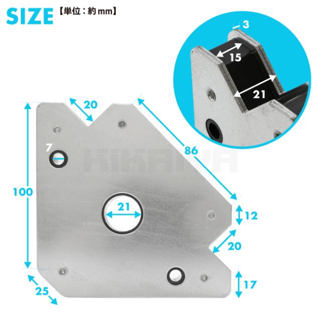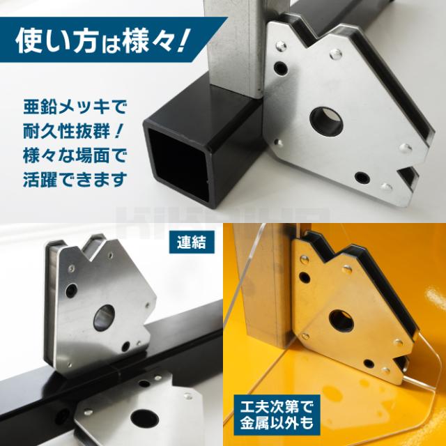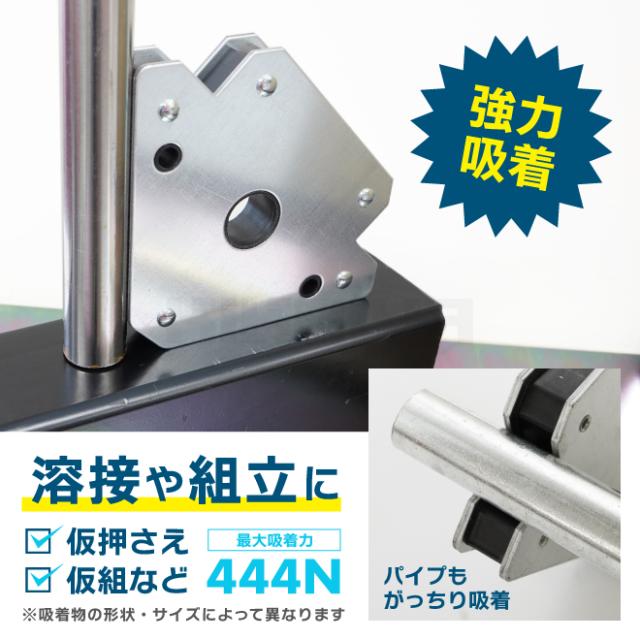 強力吸着!溶接や組立作業での仮押さえ、仮組みなどに ●溶接作業や組立て作業時にあると便利な溶接ホルダーです ●仮押さえや仮組みの際にさまざまな角度で金属を保持します ●45度・90度・135度・180度などの保持角度がとれます ●444Nと強力な吸着力で、素早くしっかりと保持できます ●溝付きなので、丸パイプや丸鋼も吸着します ●亜鉛メッキで耐久性抜群!様々な場所で活躍できます ※非鉄金属には使用出来ません ※重量物や大きな物への使用は危険ですのでおやめください |