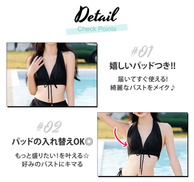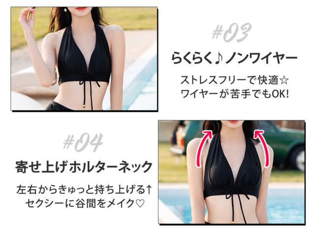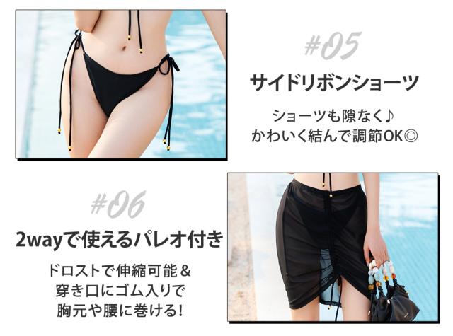 春新作 即納 水着 レディース ビキニ パレオ 3点セット オシャレ 可愛い 大人 セクシー 黒 無地 シンプル リボン 2way 腰巻き 胸元カバー シースルー ドロスト ホルターネック ハイレグショーツ 脚長効果 ノンワイヤー パッド付き お尻 太もも 脚 下半身 カバーアップ