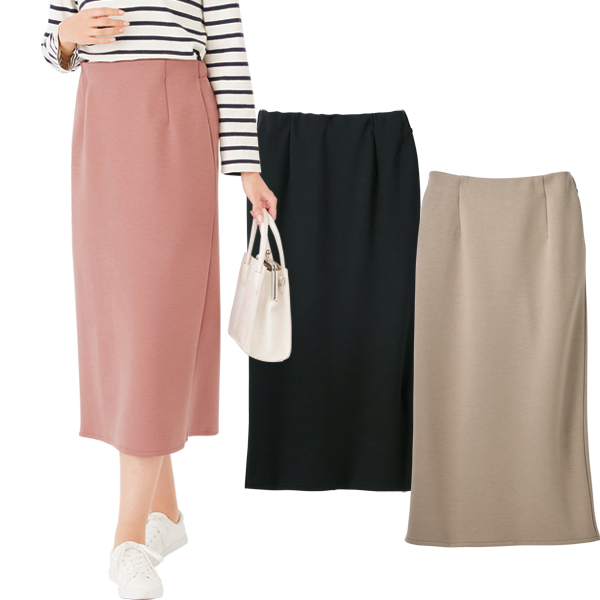 見た目はキレイめナロースカートなのに、実は「軽量・快適・お手入れ簡単」ジャージ素材。肌ざわりがとても良い段ボールニット、ウエスト後ろゴムではき心地ラクラクなスカート。洗い替えに便利なモカ・スモークピンク・ブラックの同サイズ3色セットです。