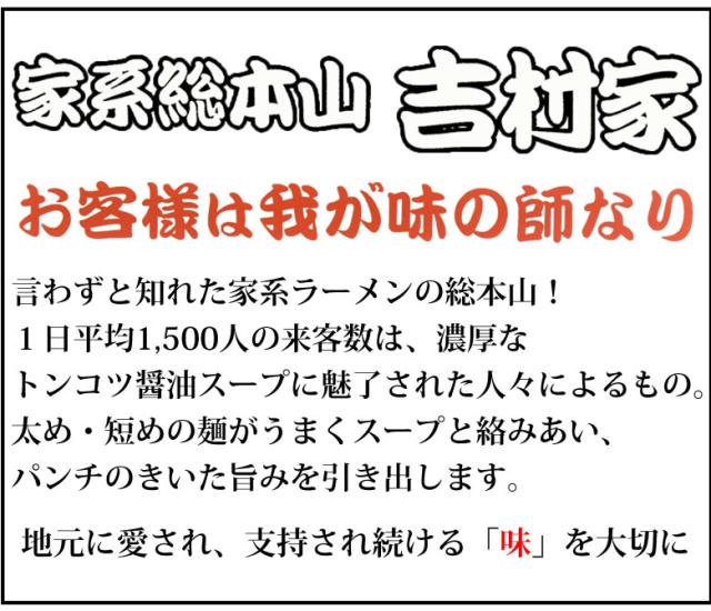豚骨醤油スープで極太ストレート麺 家系ラーメンの元祖 言わずと知れた家系ラーメンの総本山! 1日平均1,500人の来客数は、濃厚なトンコツ醤油スープに魅了された人々によるもの。 太め・短めの麺がうまくスープと絡みあい、パンチのきいた旨みを引き出します。