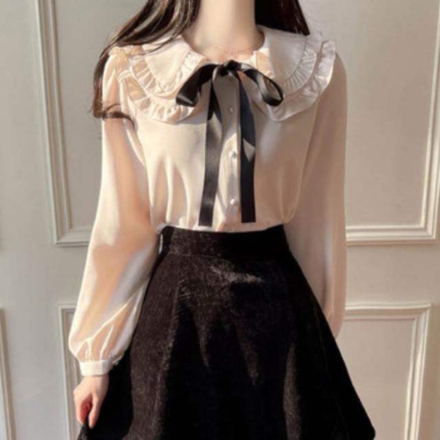 ブラウス レディース シャツ 長袖 ボウタイ リボン シフォン フリル トップス 韓国ファッション 春 秋 量産型 量産型 地雷系