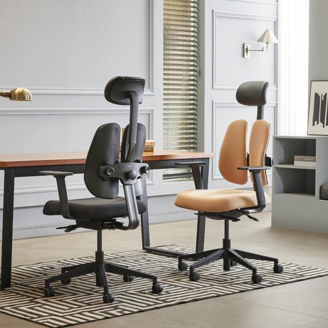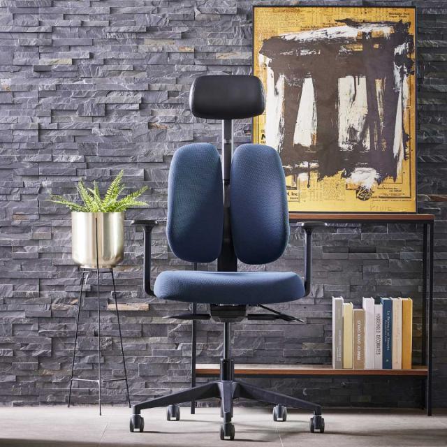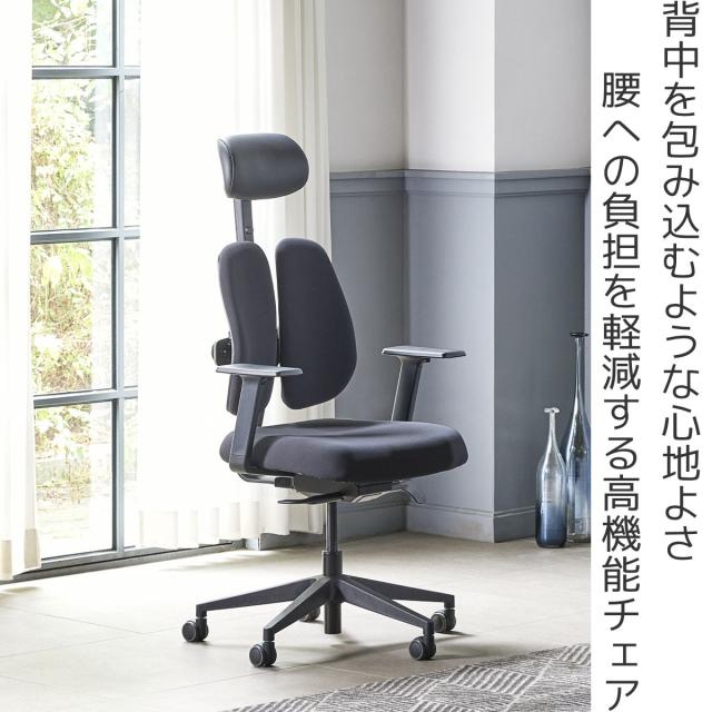 立体的に動く背もたれが左右から腰・背中をやさしく包み込み、どんな着座姿勢でもしっかりとホールドします。腰への負担を最大約30kgも軽減するので、長時間座るときでも快適です。また2つの背もたれの間には隙間が空いているため脊柱を圧迫せず、腰が気になる人にもやさしい座り心地です。
