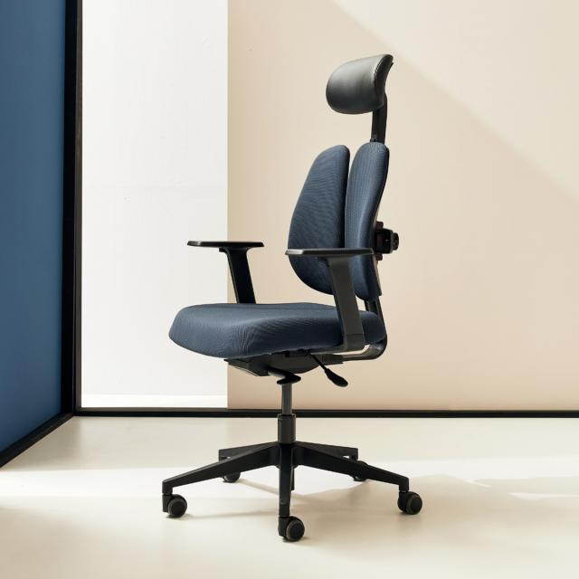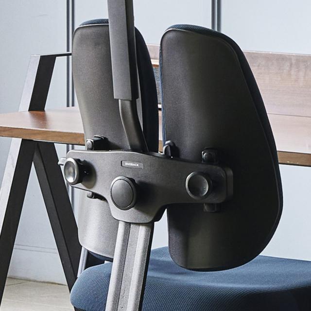 背もたれ裏面のツマミで背もたれを上下左右に調節し、理想的な位置に固定することができます。2つの背もたれで均等に腰回りを包み込んで体圧を分散し、背筋をサポートします。