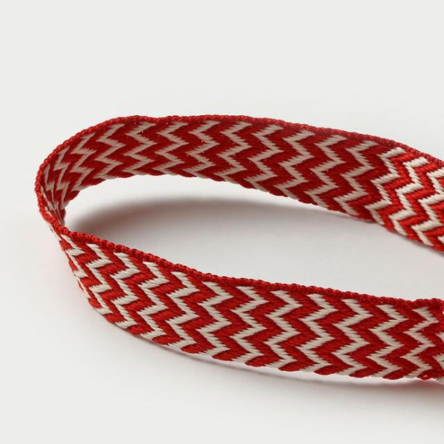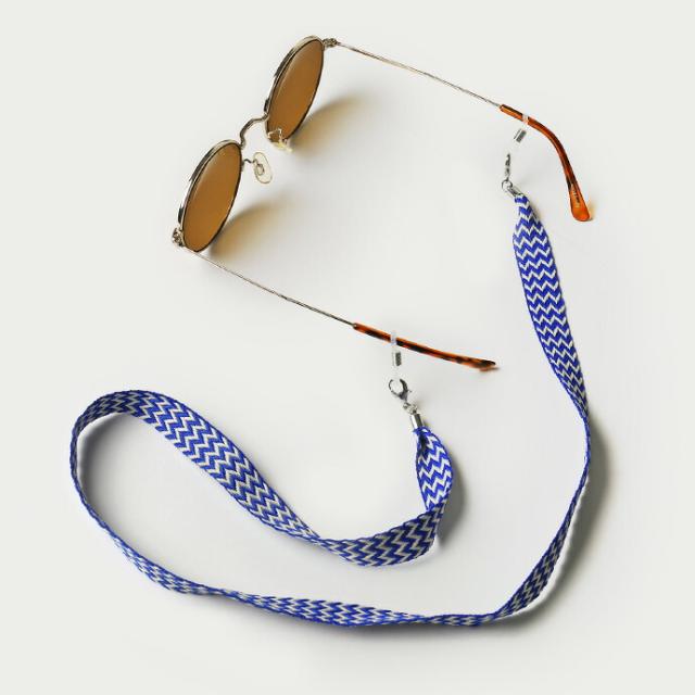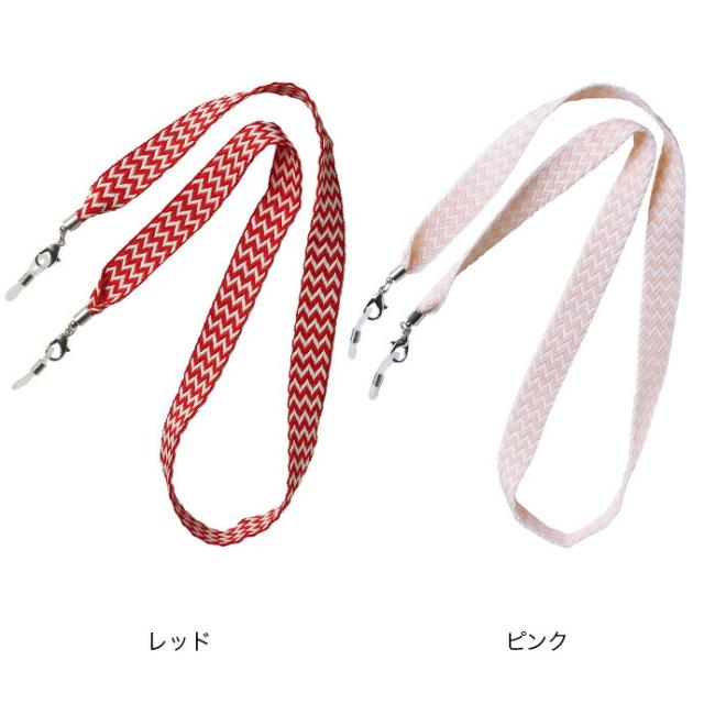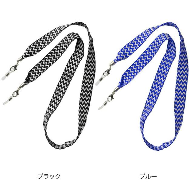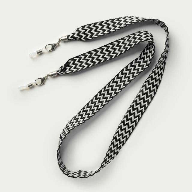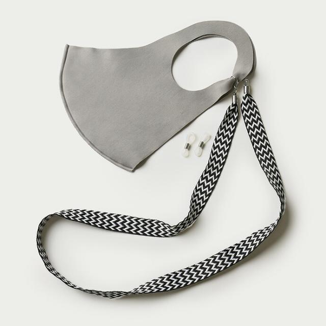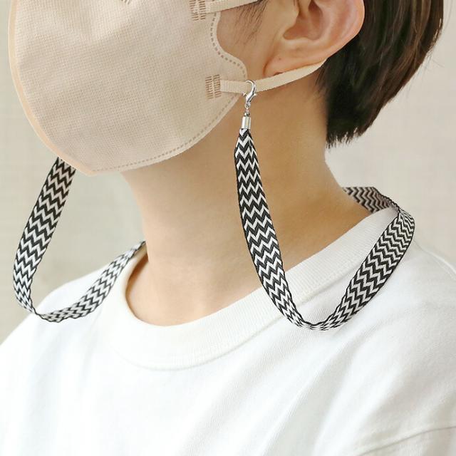 ジグザグ模様のシェブロンストライプが目を引く幅広のマスクストラップです。軽くて丈夫なポリエステル製コードを使用しています。マスクチェーンがあればマスクを外してサッと首から下げられるので、置き場所に困らず無くす心配も無用に。両手も使えて、アゴにかけたり机に置いたりするよりも衛生的です。