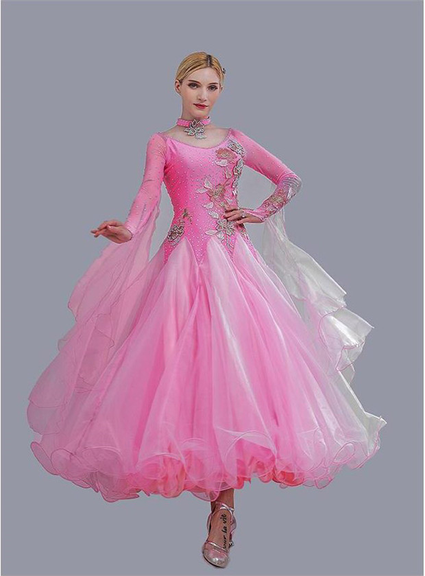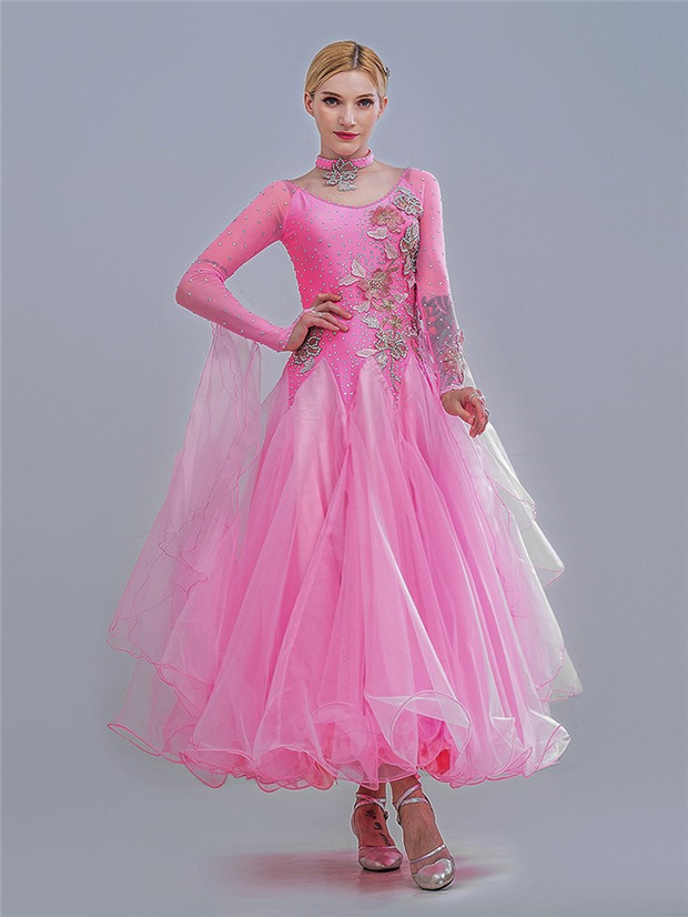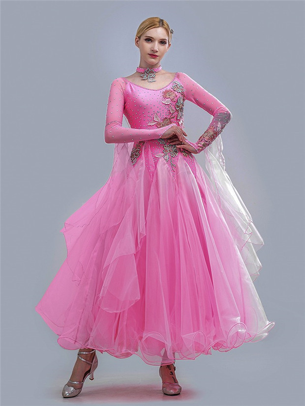 社交ダンス衣装 キラキラ 社交ダンス モダン ピンクドレス 衣装 発表会 広がる裾 豪華 競技着 練習着 演出用 スタンダード ワルツダンス デモ用 パーティー用 S M L XL 2XL dm570c0c0la
