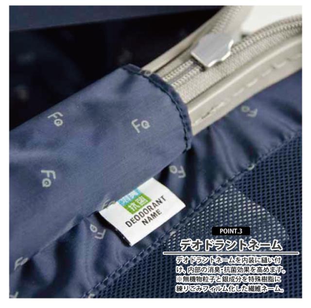 デオドラントネームを内装に縫い付け、内部の消臭・抗菌効果を高めます。