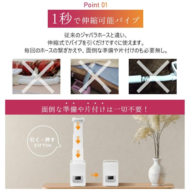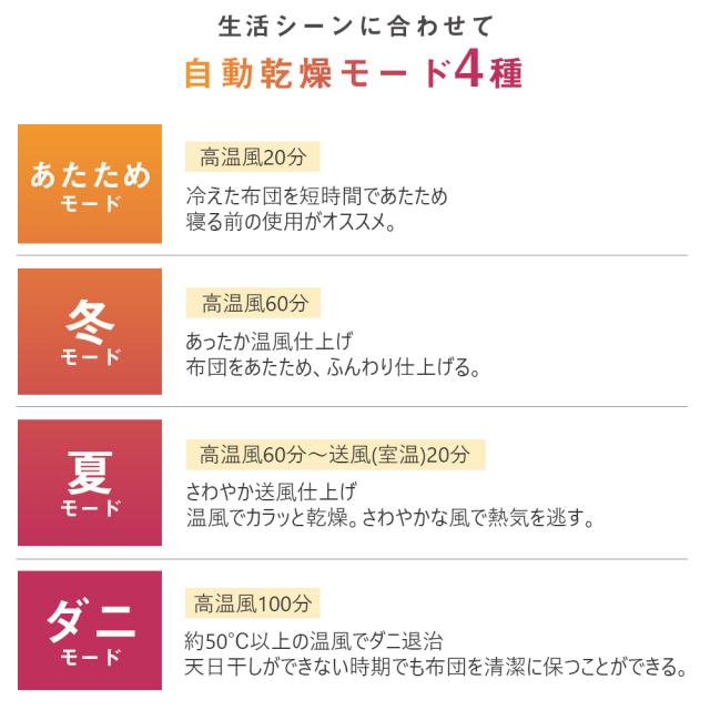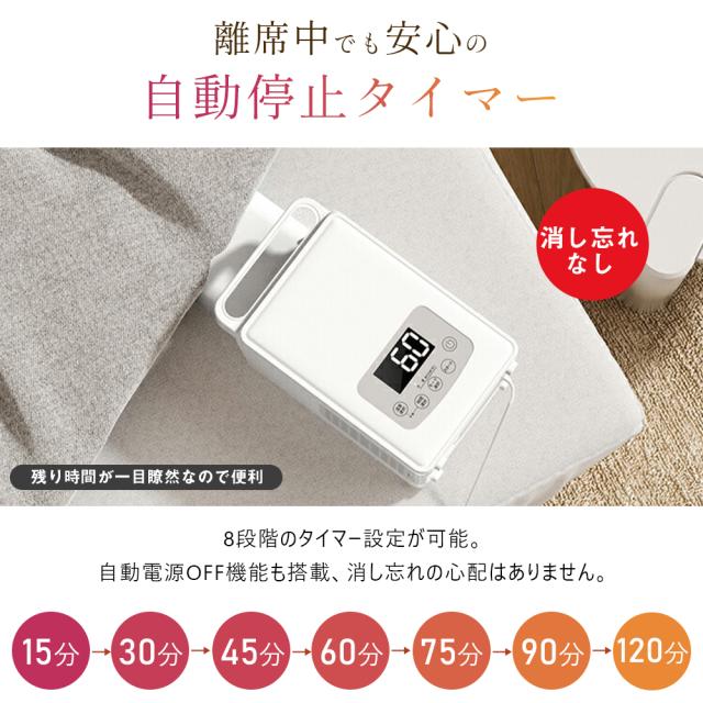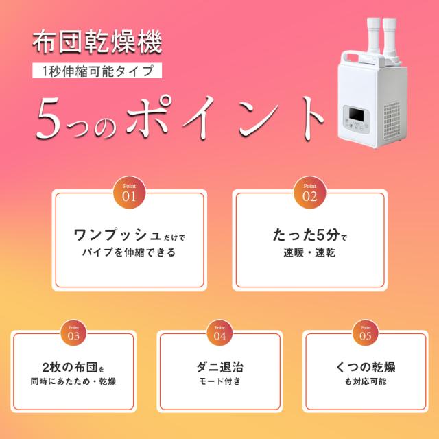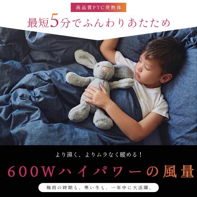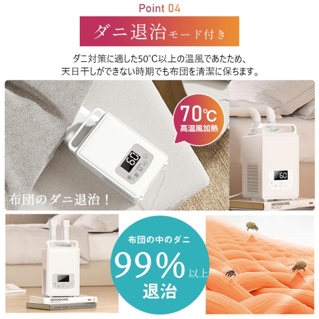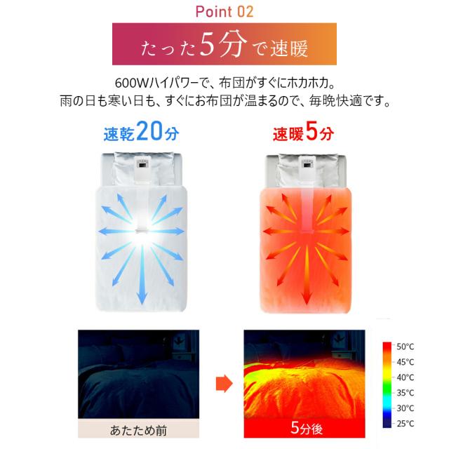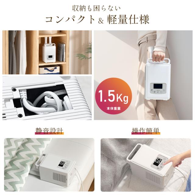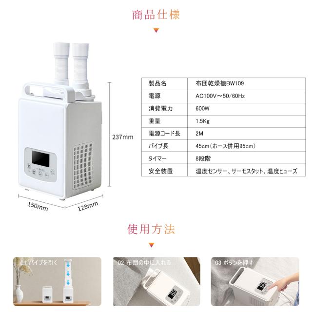 ・ホースやマットの破損する心配なし。 ・600Wハイパワー x 高品質PTC発熱体で5分速暖。 ・2本の送風ノズルで2枚の布団を同時に乾燥。 ・ダニモード搭載、約70℃高温でダニ退治。 ・立体ノズルで布団の隅々まで暖める。 ・靴乾燥も対応可能。 ※本革や合革、ビニール製など耐熱温度の低い素材の場合、「送風モード」を使用ください。 ・1.5Kg超軽量設計で持ち運びにラクラク。 ・3段階温度調節:室温→45℃→50℃→55℃→60℃→65℃→70℃。 ・7段階時間調節:15→30→45→60→90→120→180(分)。 ・マット不要でも利用できる。 ・コンパクトなボディで収納に困らない。 ・衣類乾燥に便利。