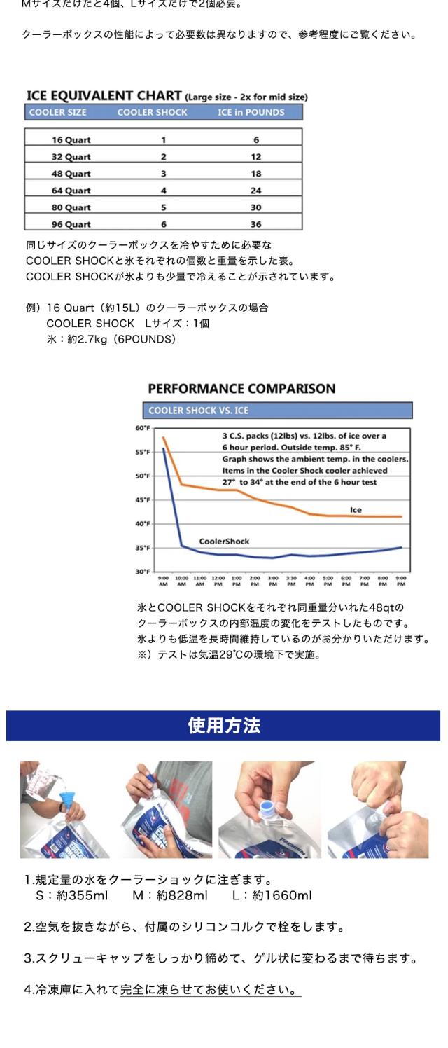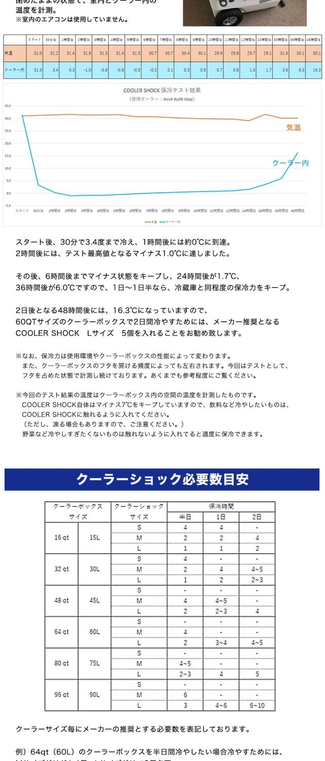 ★ クーラーショックは氷と比較した場合、同じ保冷力に必要とする量も少なくて済むので、クーラーボックスの重量は軽減され、スペース効率も向上します。