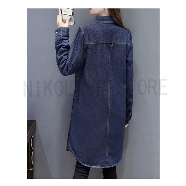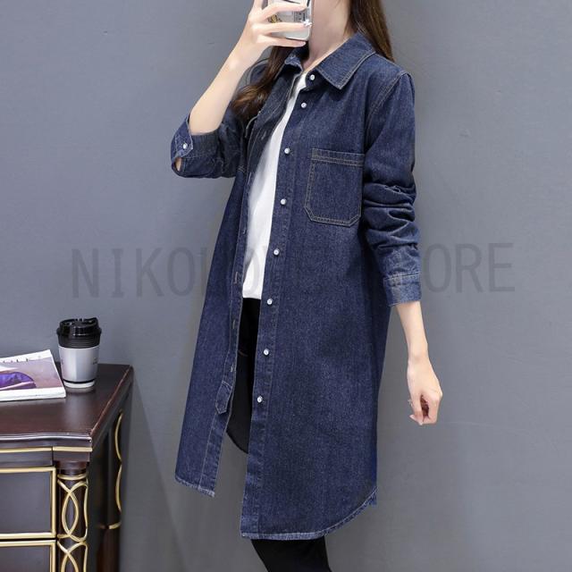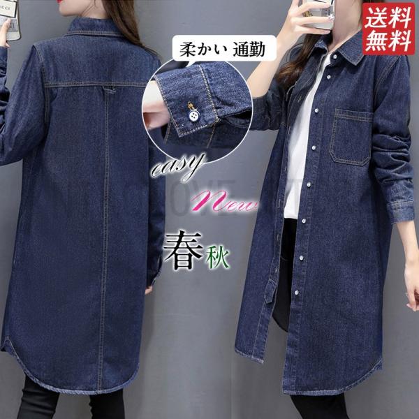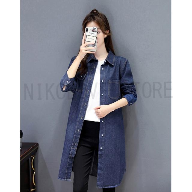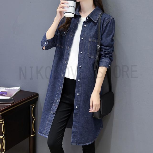 シャツ ロング丈 デニムシャツ ジャケット ロングシャツ デニム S-3XL 大きいサイズ 前開き 長袖 体型カバー 無地 デニムワンピース 送料無料
