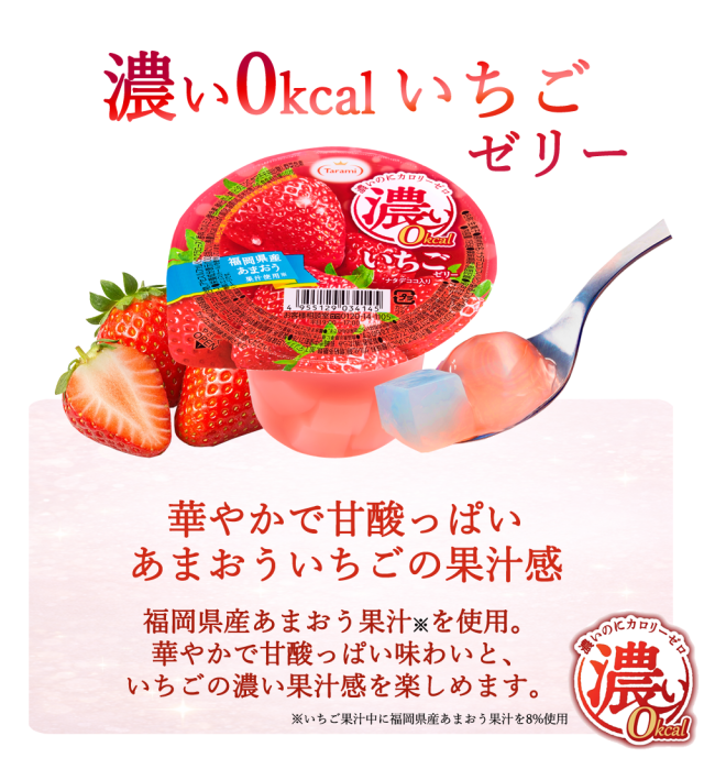 ■原材料名:ナタデココ(フィリピン製造又はタイ製造)、エリスリトール、いちご果汁(福岡県産あまおう2%)、りんご果汁/酸味料、香料(オレンジ由来)、ゲル化剤(増粘多糖類、加工デンプン)、甘味料(アスパルテーム・L-フェニルアラニン化合物、アセスルファムK、スクラロース)、カルミン酸色素、酸化防止剤(ビタミンC、ヤマモモ抽出物)、野菜色素