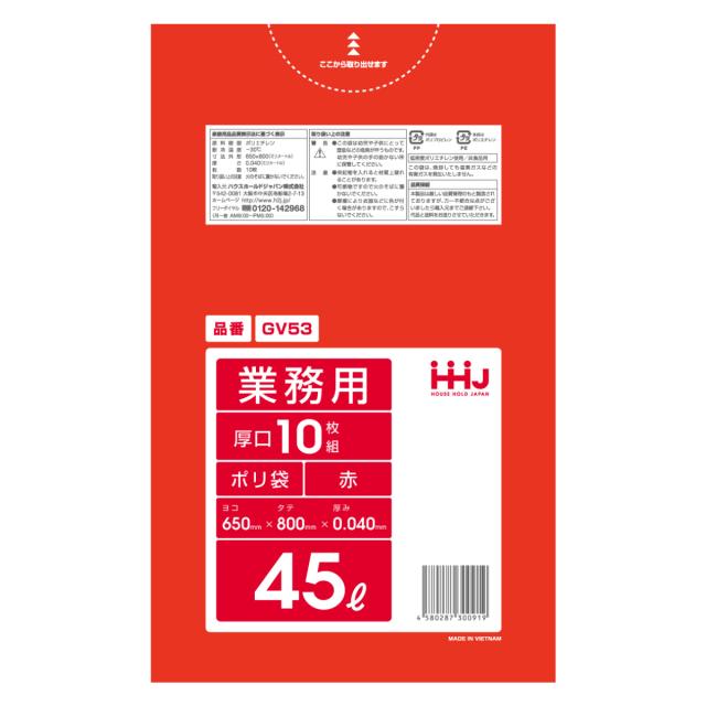 ゴミ袋 45L 80×65cm 厚さ0.04mm 10枚入 赤 GV53 ( ポリ袋 ごみ袋 45リットル 10枚 ゴミ 袋 赤色 縦80cm 横65cm ツルツル ポリエチレン キッチン リビング 消耗品 常備品 色付き )