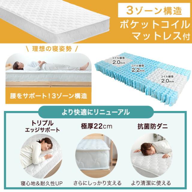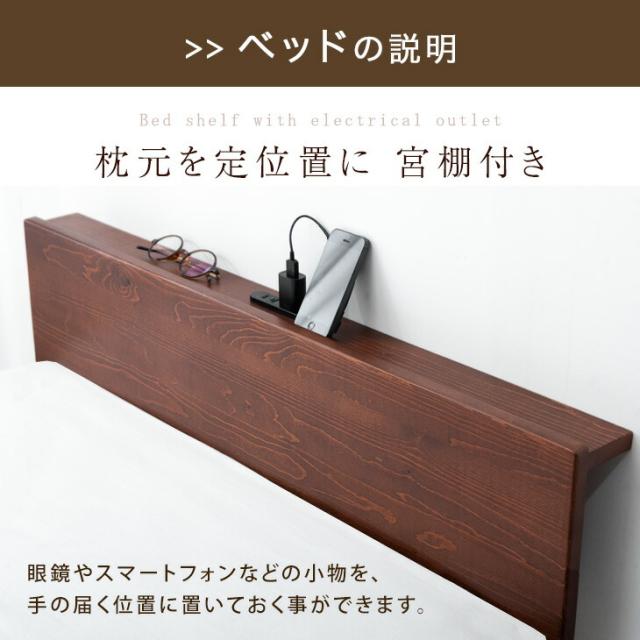 セミダブルベッド マットレス付き 3ゾーン構造 ポケットコイルマットレス 宮棚&2口コンセント すのこベッド ベッド セミダブル フレーム マットレス付き ベッドフレーム スプリングマットレス ポケットマットレス 宮棚付き【商品番号:49600820】