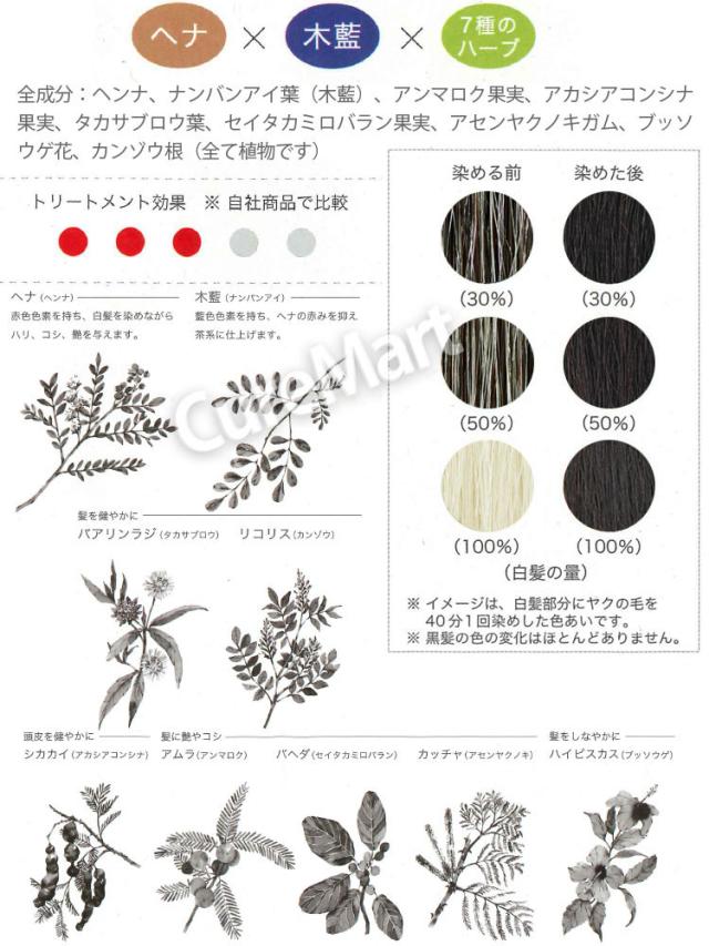 全成分:ナンバンアイ葉、ヘンナ、アンマロク果実、アカシアコンシナ果実、タカサブロウ葉、セイタカミロバラン果実、アセンヤクノキガム、ブッソウゲ花、カンゾウ根