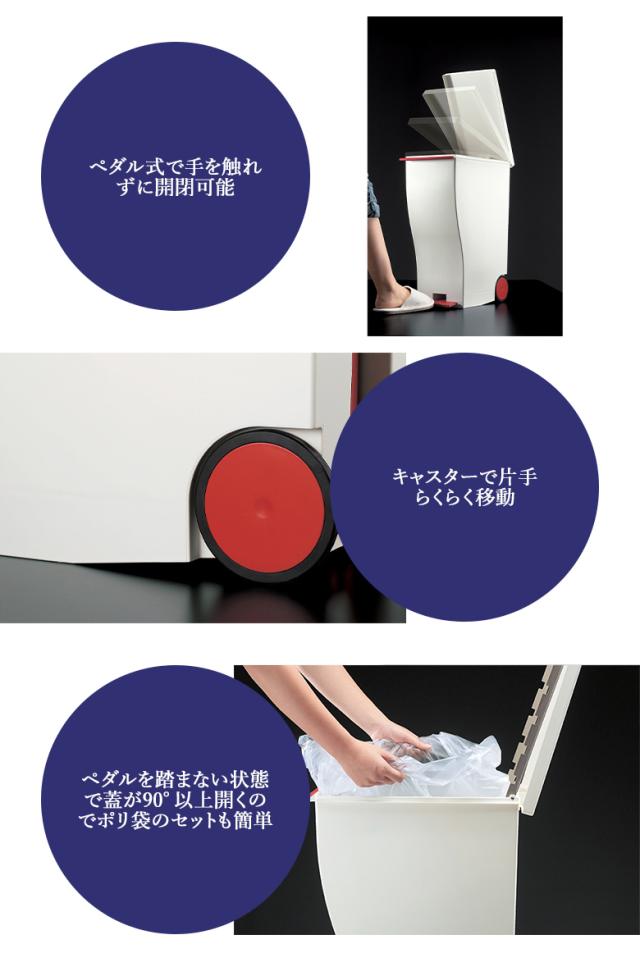 ワイドで踏みやすいペダル式で手を触れずに開閉でき、ペダルは全体から出っ張らず、足元が邪魔になりません。