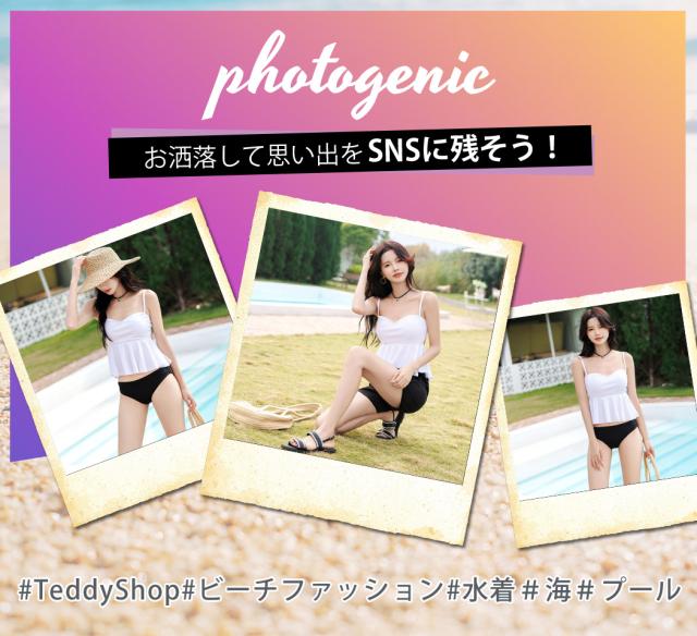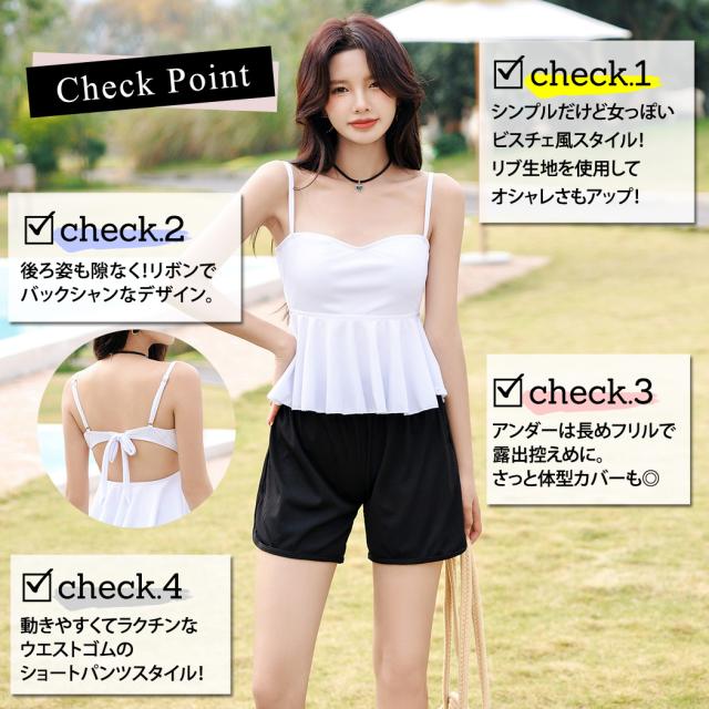 春新作 水着 レディース ビキニ ビスチェ セパレート 3点セット おしゃれ かわいい 白 黒 無地 モノトーン シンプル ショートパンツ フリル リボン バックシャン バックリボン リブ ノンワイヤー パッド付き ウエスト お腹 ヒップ お尻 カバーアップ 肩紐 調節 ウエストゴム