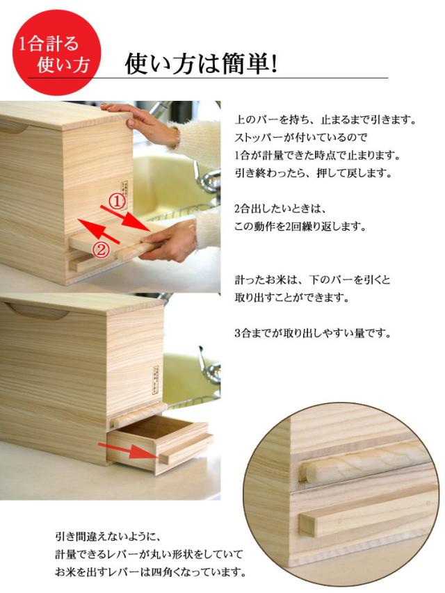 それから、職人が作り気密性が高いが、1合升で計量し上からすくうため、使い切らないとお米の補充ができない。