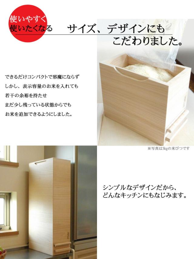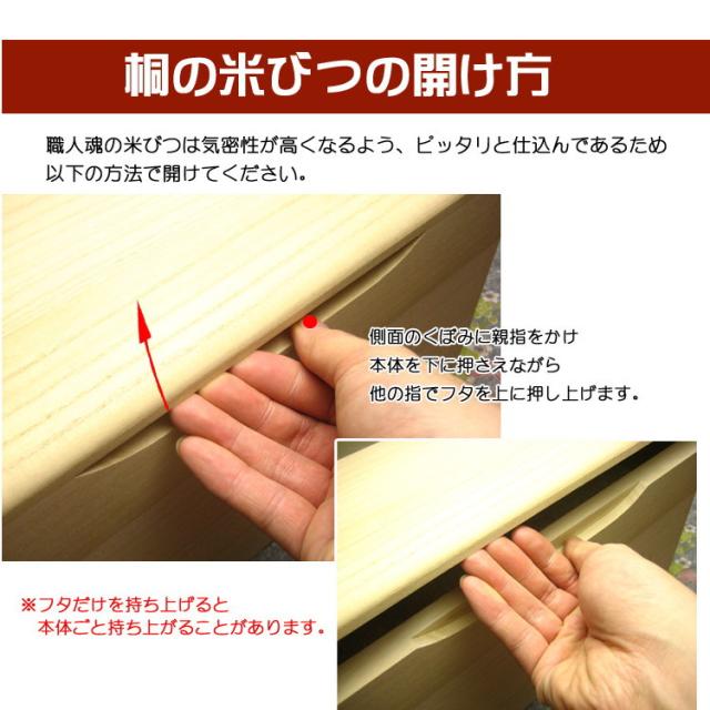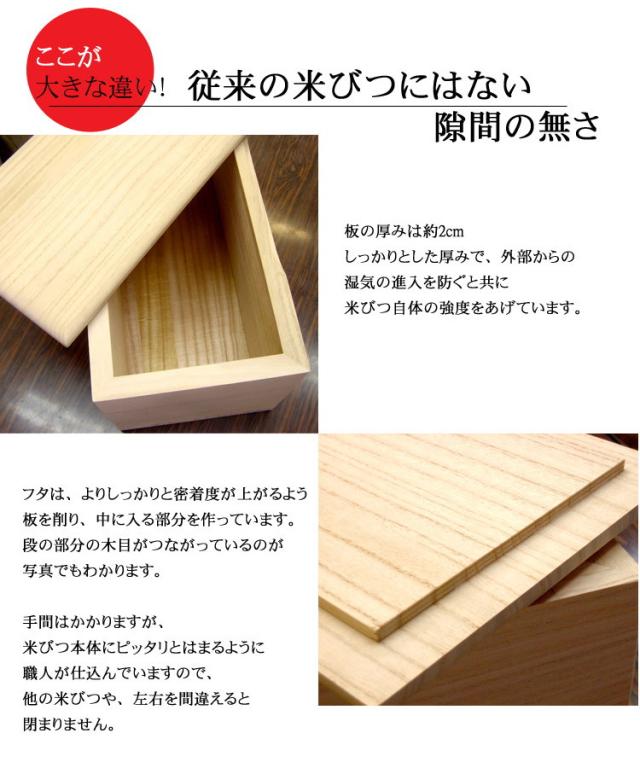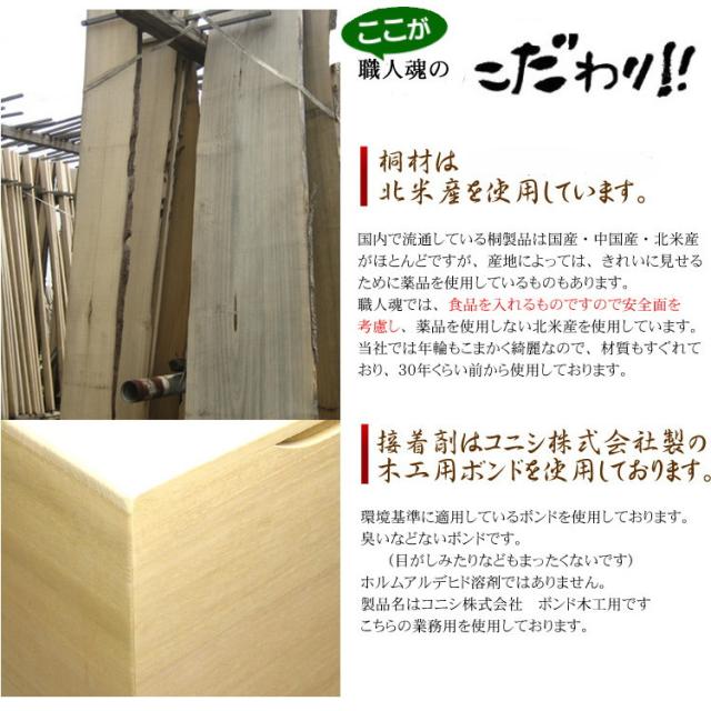 桐だけで作り、虫を防ぎ、調湿もできる。お米をすりきる構造にも、壊れたりはがれたりする心配のないように他の素材を(ゴムやガムテープ)等を使わず100%桐だけで作ること。